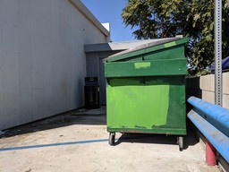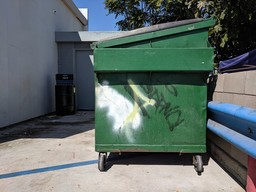 Green Dumpster at a Gas StationOctober 5, 2019 Found and covered in Corona, CA at a gas station. The original sloppy graffiti and a previous mismatching coverup Covered the graffiti in green